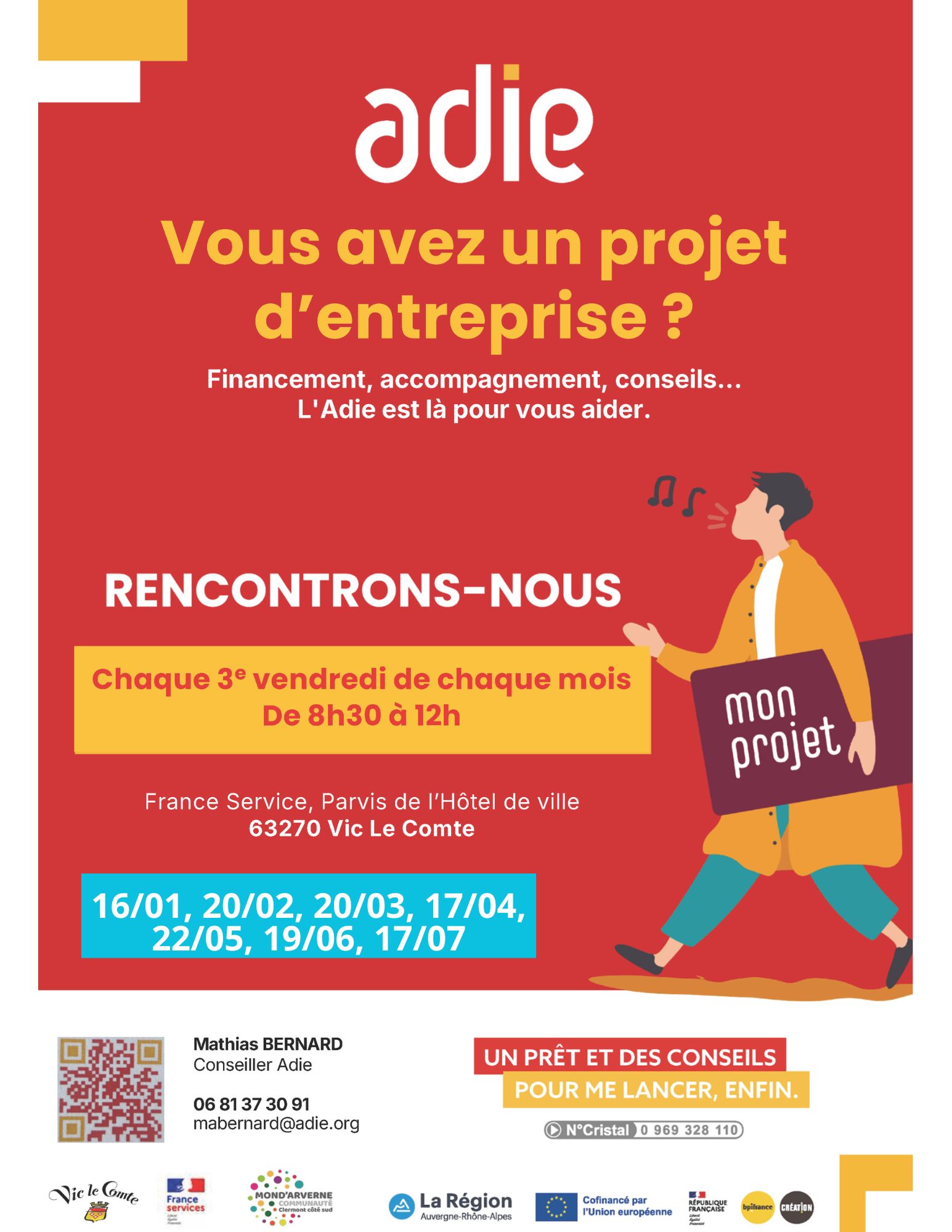 | L’ASSOCIATION ADIE (Association pour le droit à l’initiative économique) vous accueille le 3ème vendredi de chaque mois de 8h30 à 12h00 à France services de Vic-le-Comte, sur rendez-vous auprès du Conseiller Mathias Bernard, au 06 81 37 30 91. Permanences prévues les 17/04, 22/05, 19/06, 17/07. L’Adie vous accompagne, vous conseille dans la création de votre entreprise ou son développement si elle existe déjà, ses démarches administratives, sa gestion. Elle peut constituer également une solution pour les projets que les Banques refusent de financer, grâce à la possibilité de microcrédits. L’Adie représente donc un partenaire précieux pour vous lancer et vous faciliter l’accès à l’entreprenariat. N’hésitez pas. | Prochain atelier : - Vendredi 17 avril de 8h30 à 12h : « Je crée ma boîte ? L'ADIE est là ! » |